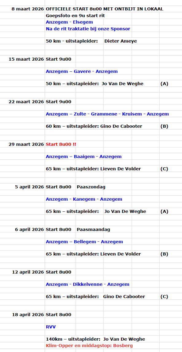 Belangrijke data voor seizoen 2026: Opening seizoen en eerste rit 8 maart 2026 Op 18/04 rijden we ons eigen Ronde Van Vlaanderen Sportief weekend begin 8-9-10 Mei 2026 Daguitstap 29 augustus op parcours van Remco Evenepoel
